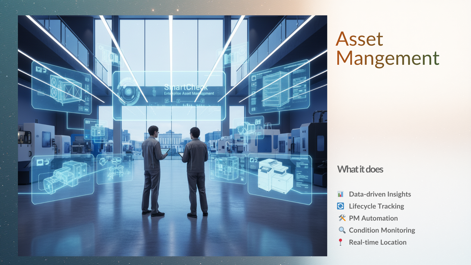 SmartCheck provides a single source of truth for all enterprise assets from acquisition to disposal. By digitizing records, automating preventive maintenance, and enabling condition-based interventions, SmartCheck helps organizations maximize asset value throughout the lifecycle. COOs and Facility Heads can shift from reactive management to a proactive, data-driven approach.